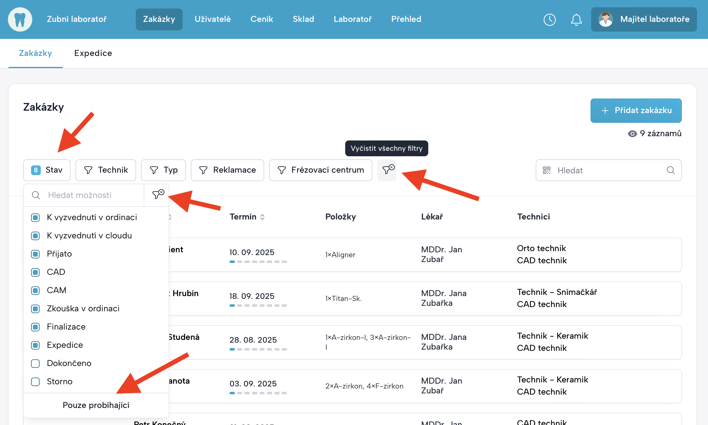 - Stav = Pouze probíhající zakázky