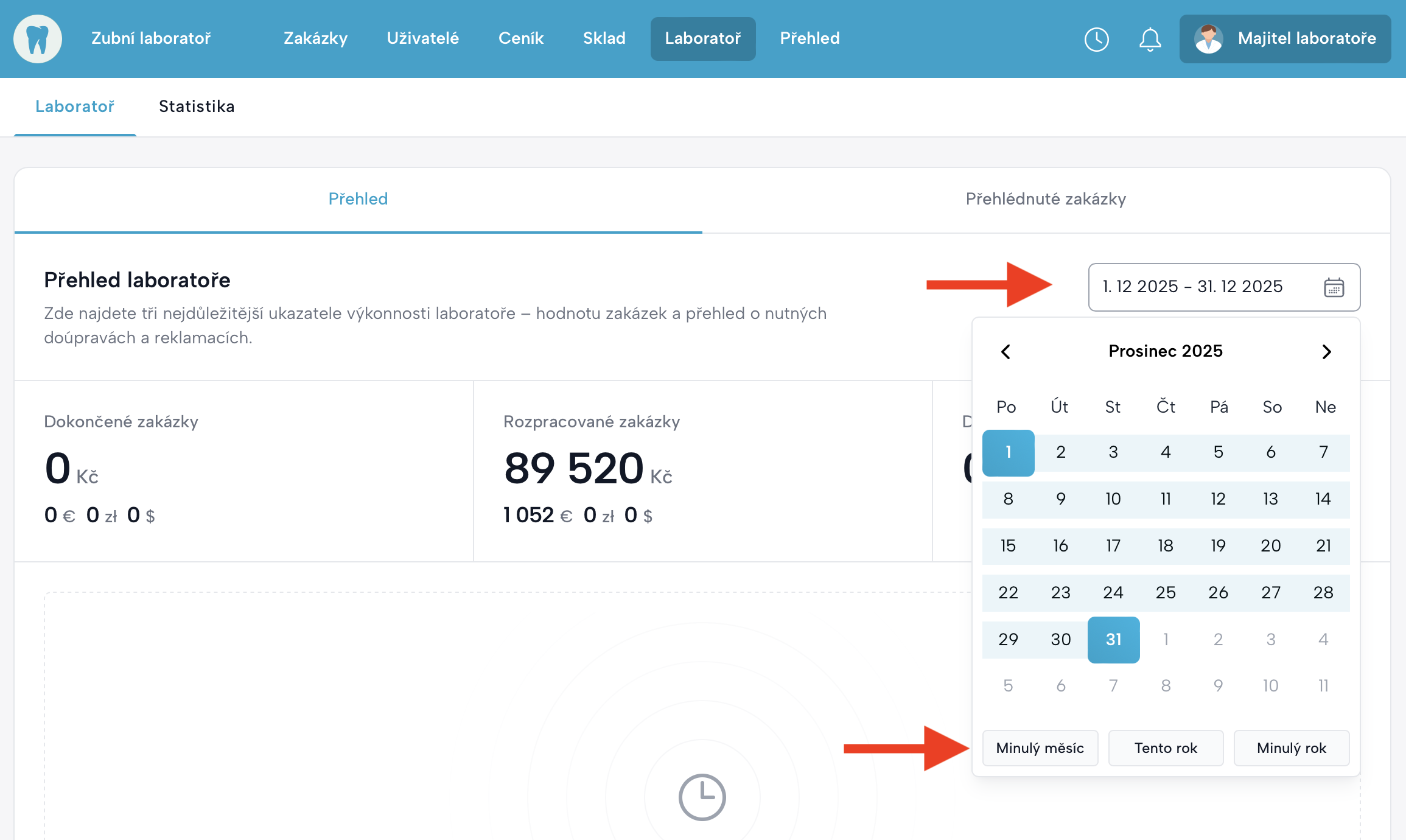 Umožňuje nastavit libovolné období, za které chcete zobrazit data o zakázkách nebo výkonnosti laboratoře.