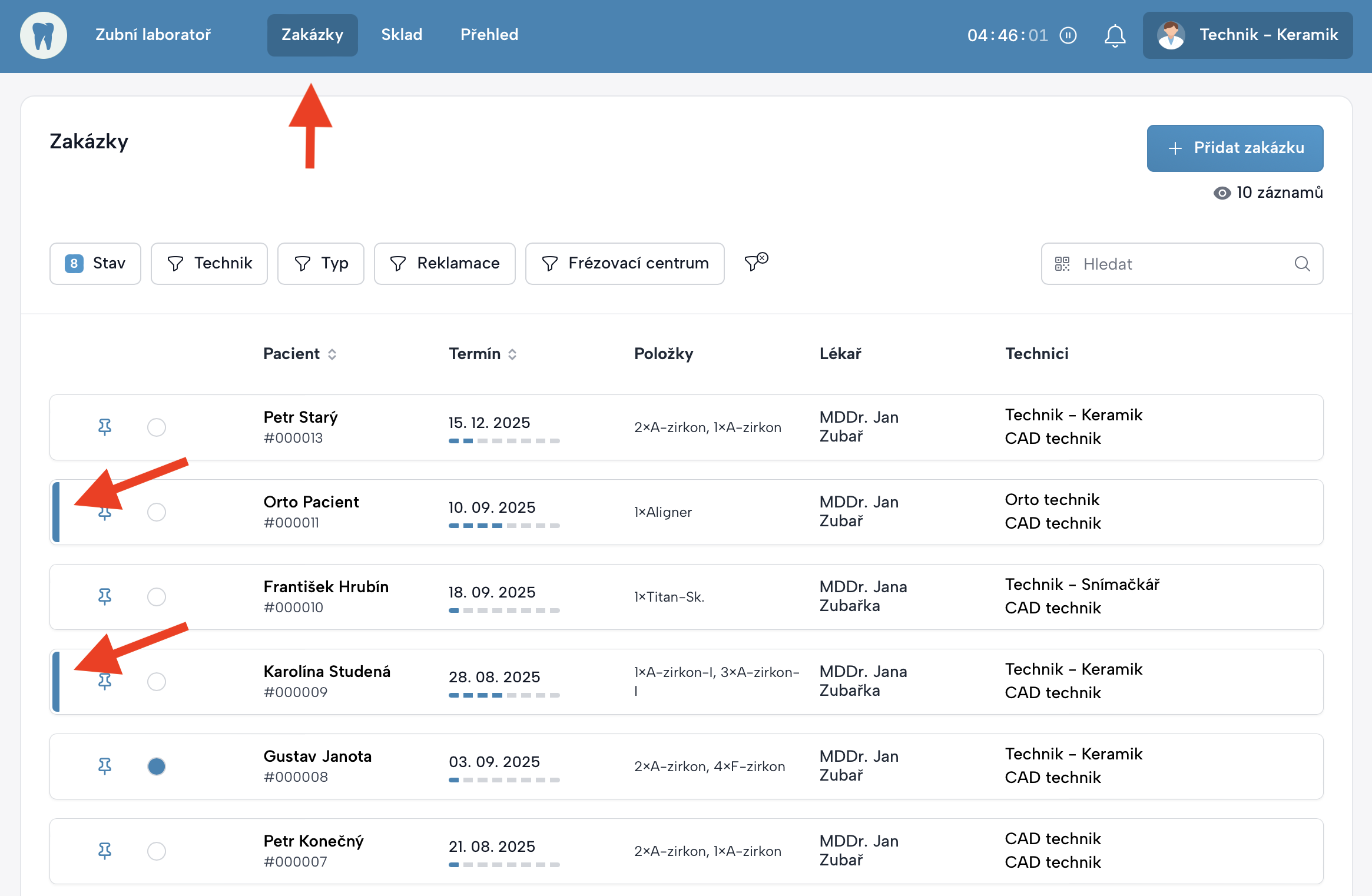 Vždy vidíte označené pouze ty zakázky, které jsou aktuální a čekají na CAM frézování, nebo jsou aktuálně dnes odeslané do frézovacího centra, nebo čekají na vložení do sintrovací pece.