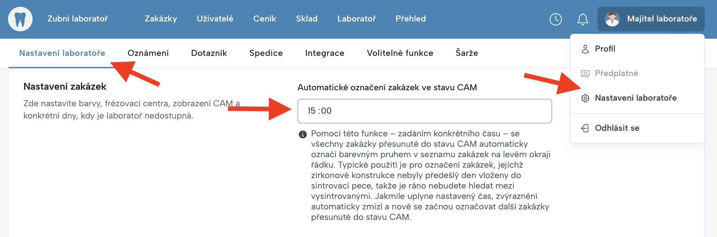 - Klikněte na Majitel laboratoře → Nastavení laboratoře.