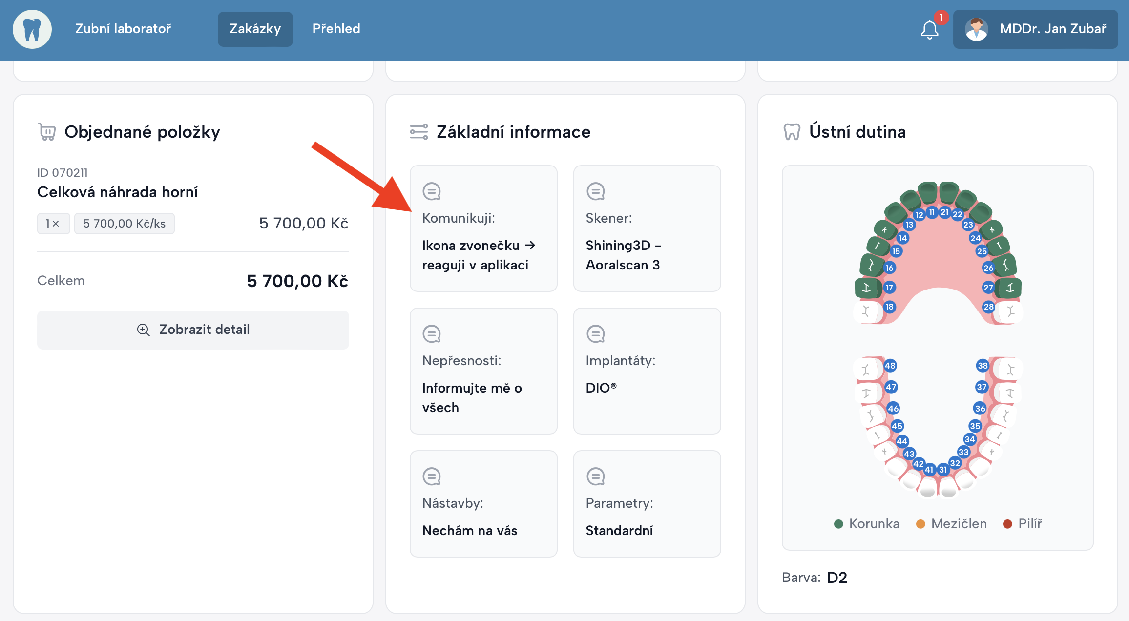 Výber lékaře je viditelný v boxu Základní informace v detailu každé zakázky.