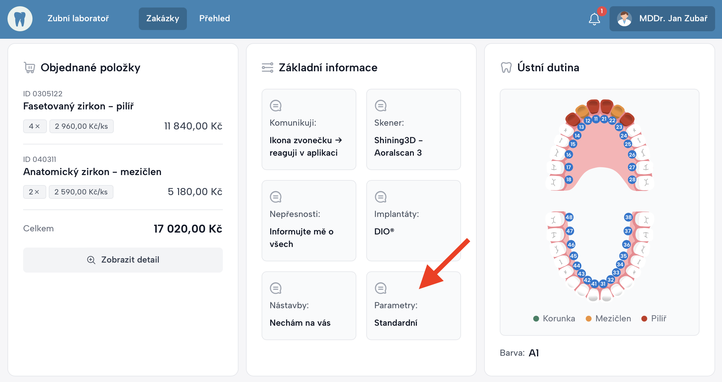 Důležité: všechny změny se vždy projeví ve všech zakázkách i zpětně. Proto je důležité z,ěny komunikovat s laboratoří a v laboratoři by měli změnu zaznamenat do poznámek nebo do Preferencí lékaře, tak aby byla dohledatelná časová osa změn.