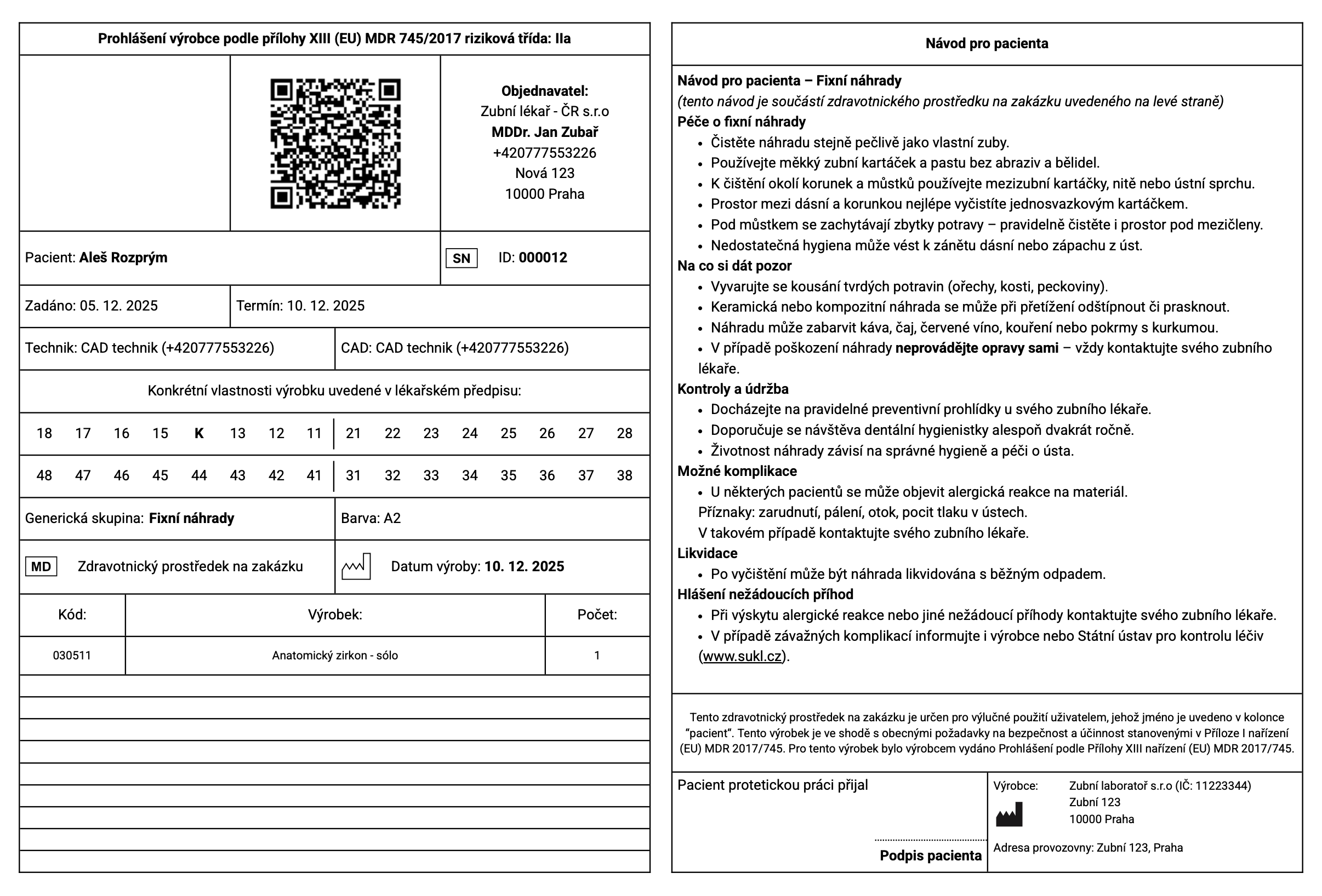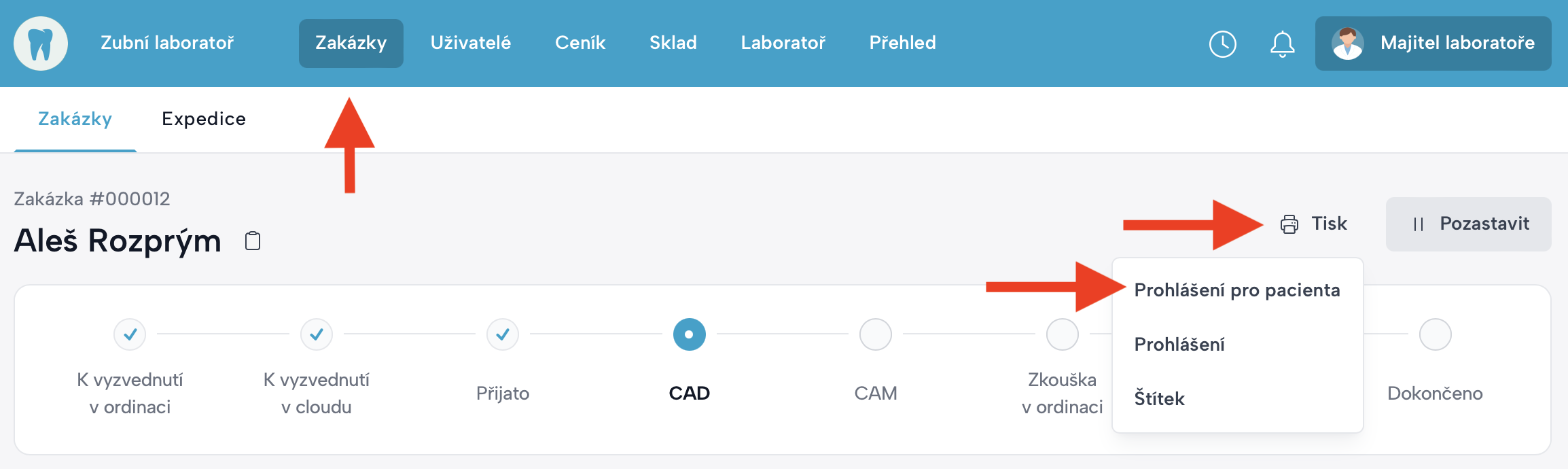 Návod pro pacienta je automaticky součástí Prohlášení pro pacienta, které lze vytisknout v detailu zakázky.
