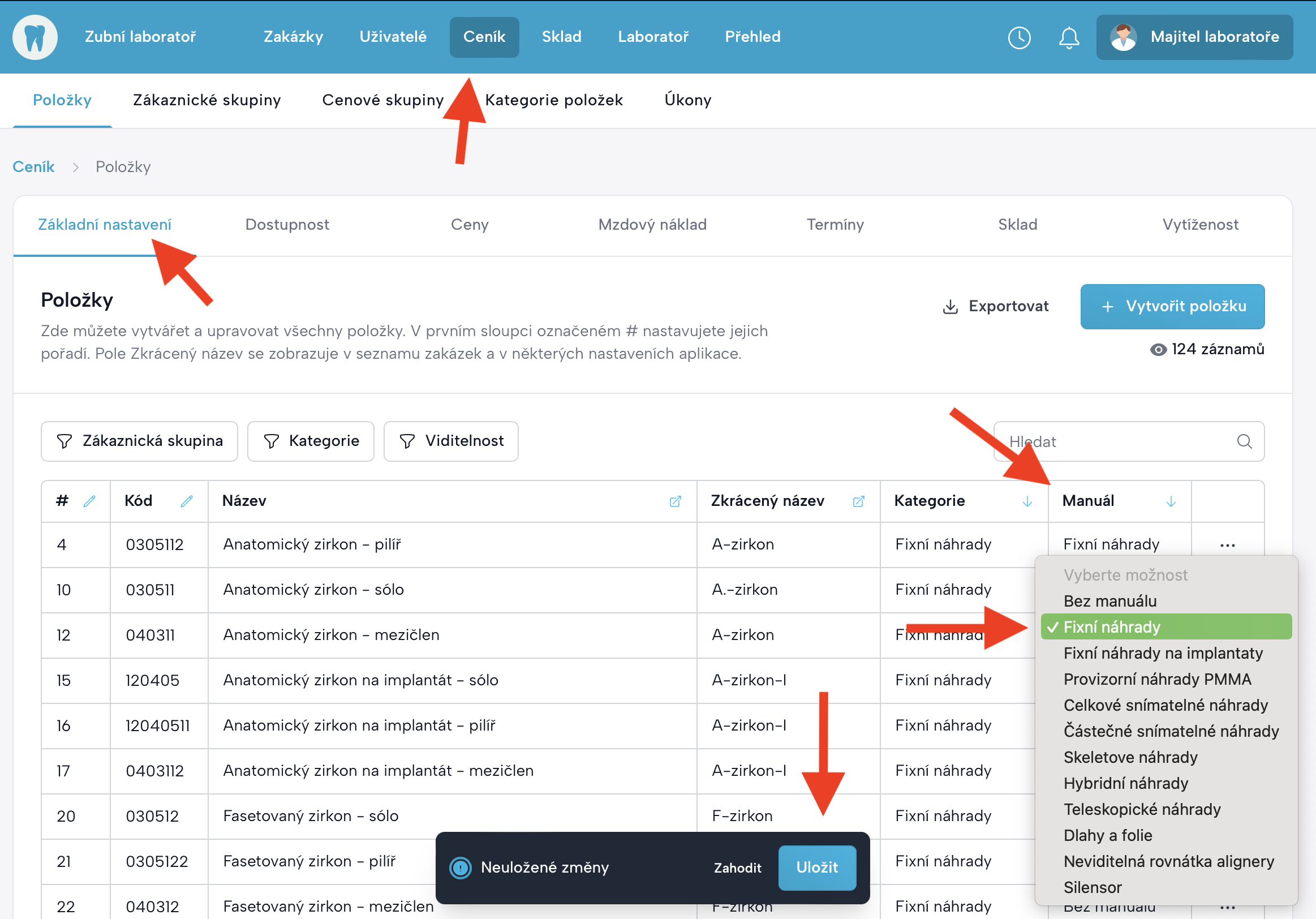 Ceník→Položky. - Otevřete