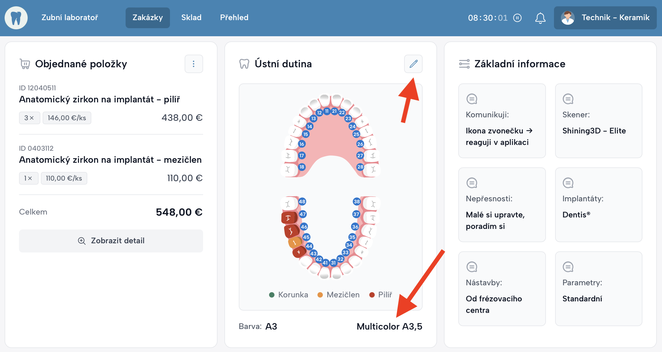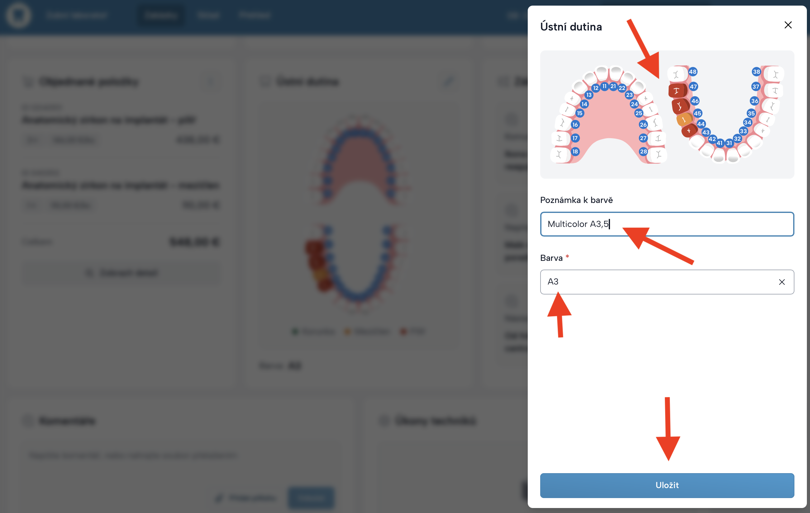 V detailu zakázky v boxu Ústní dutina může technik kdykoli upravit: