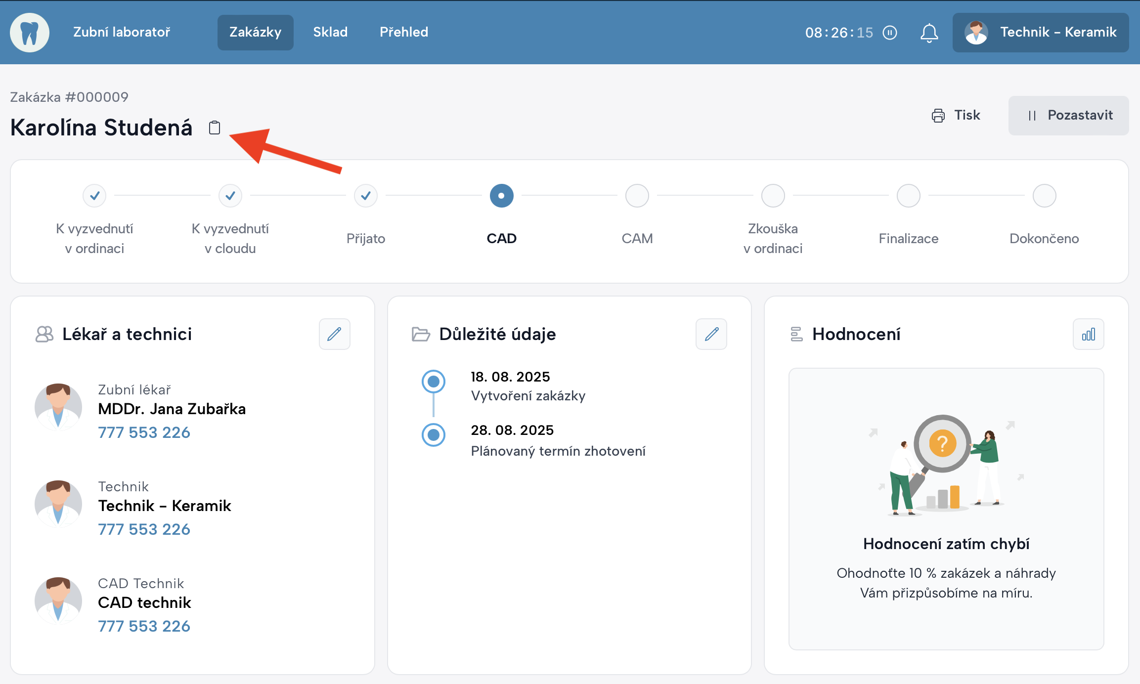 V detailu zakázky je vedle jména pacienta ikona kopírování. Jedním kliknutím se celé jméno uloží do paměti (schránky) a může být okamžitě vloženo do jiné aplikace.