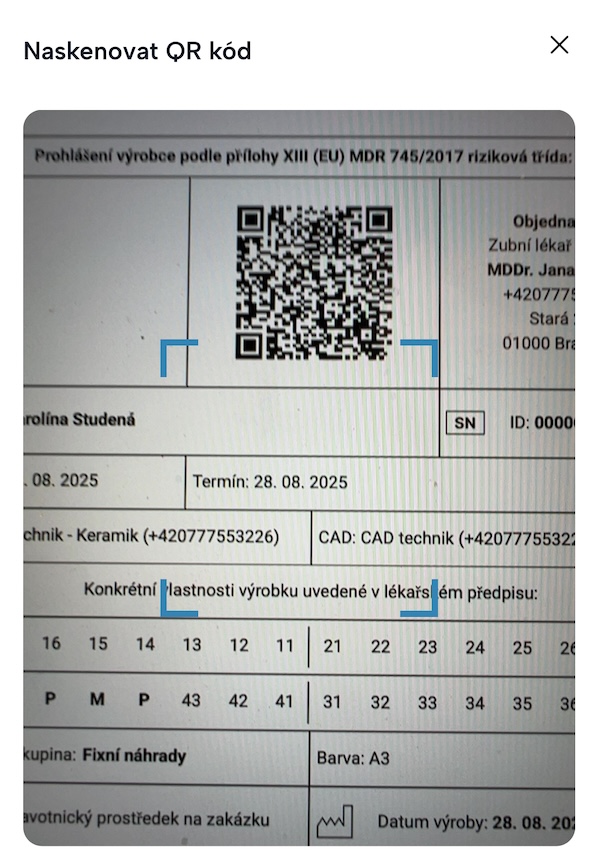 - Skenování QR kôdu funguje u všech Prohlášení generovaných v MyDentLabu.