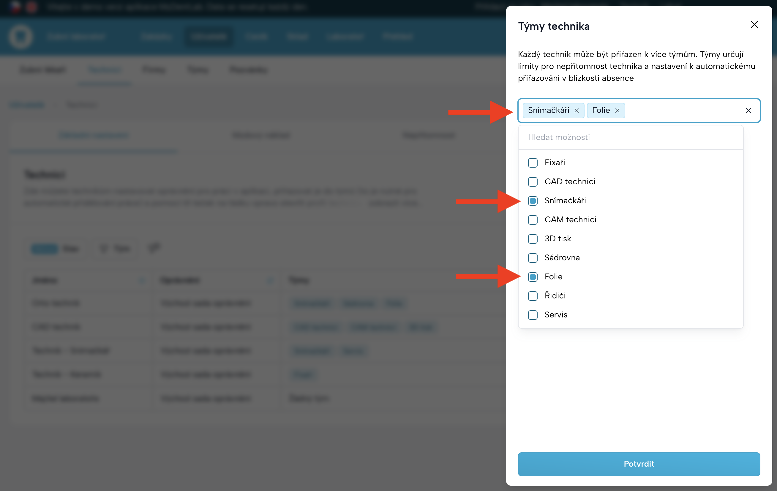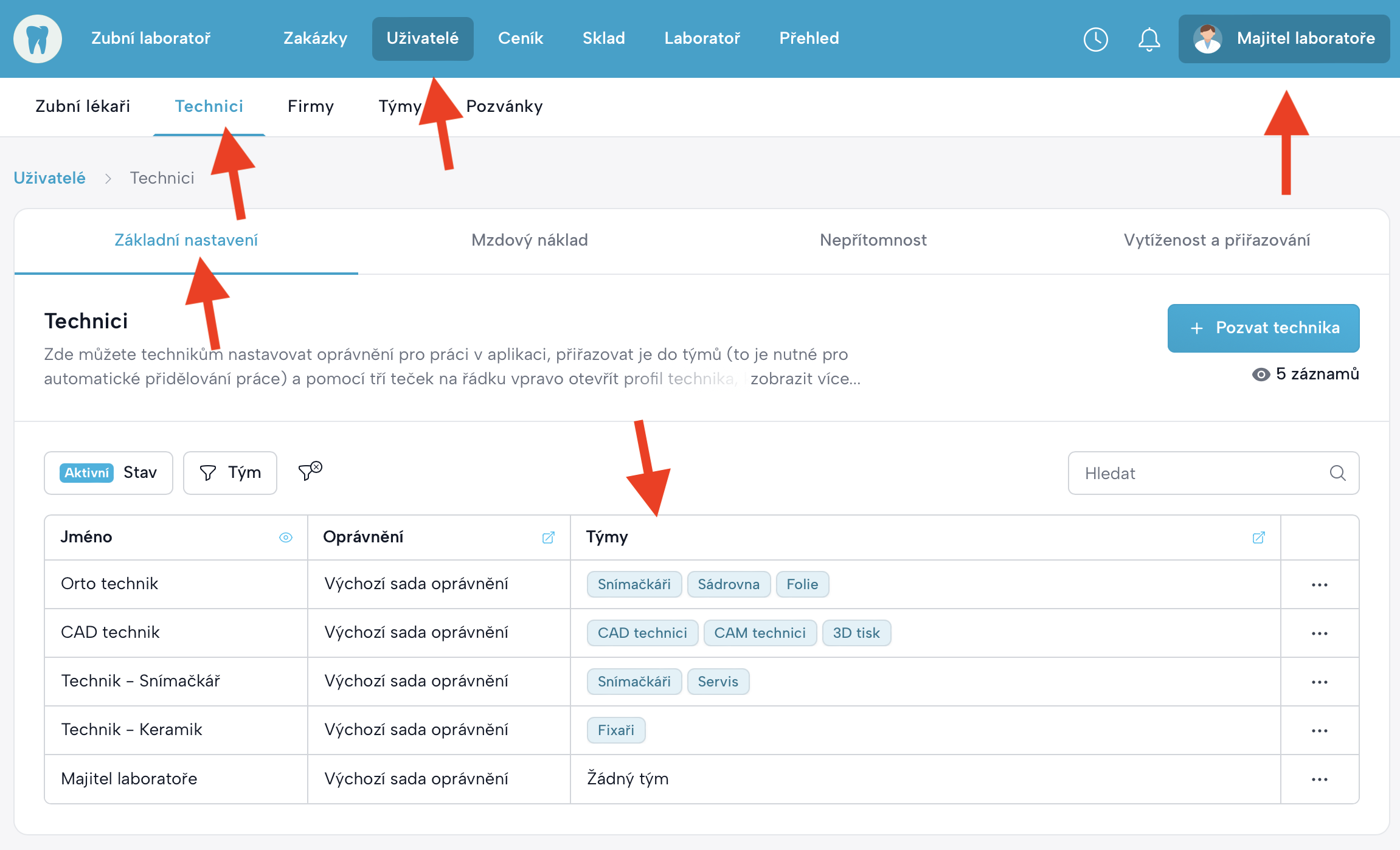 Uživatelé→Technici→Základní nastavení→Týmy. - Klikněte na řádek technika ve sloupci Týmy.