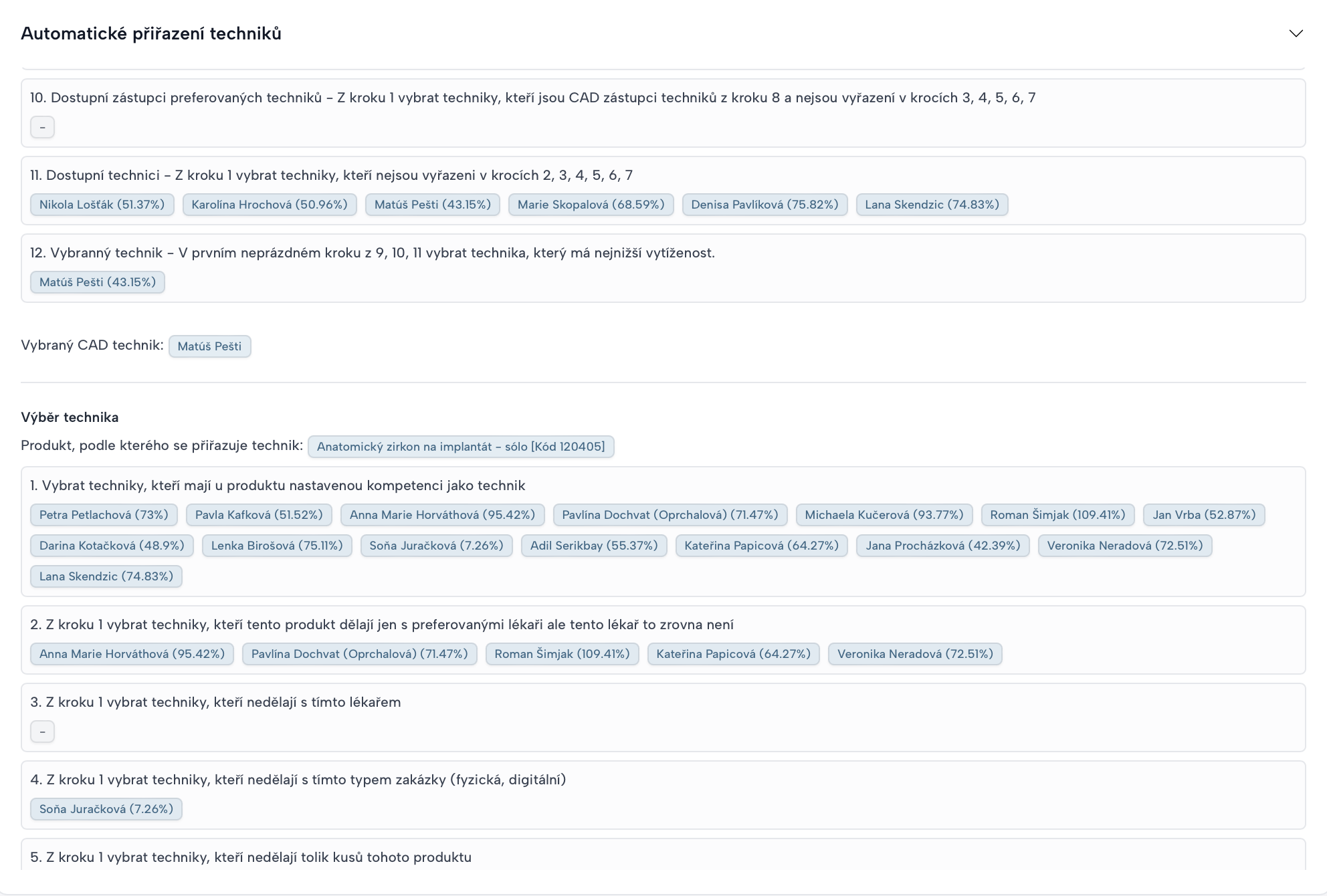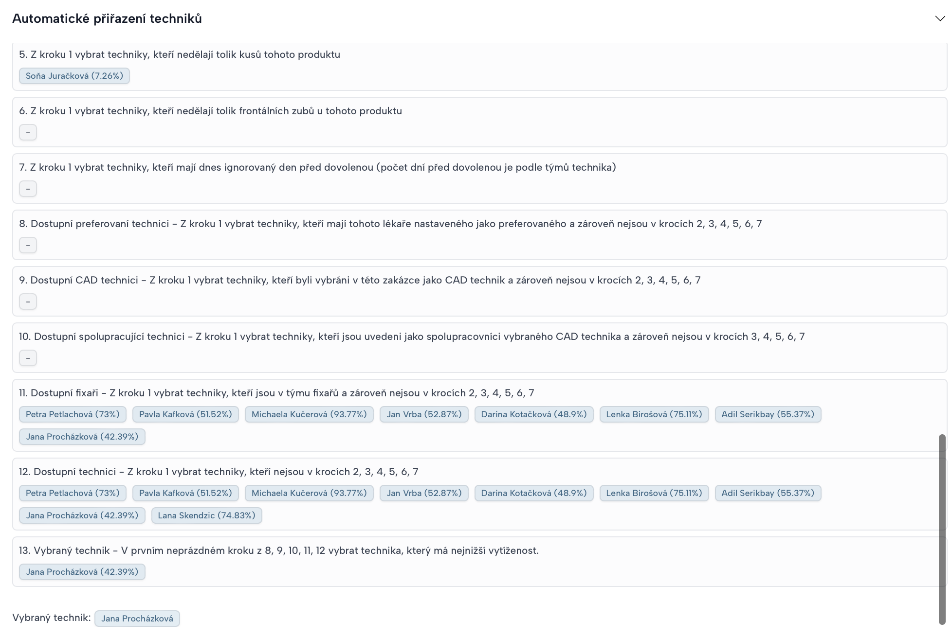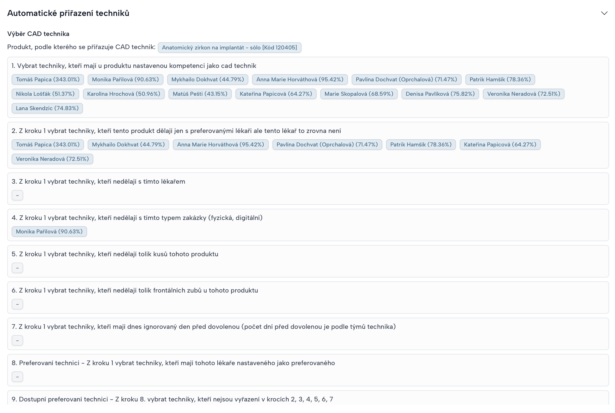 V prvním kroku systém vybere všechny techniky, kteří mají u produktu nastavenou kompetenci CAD technik. Tyto techniky zobrazí.