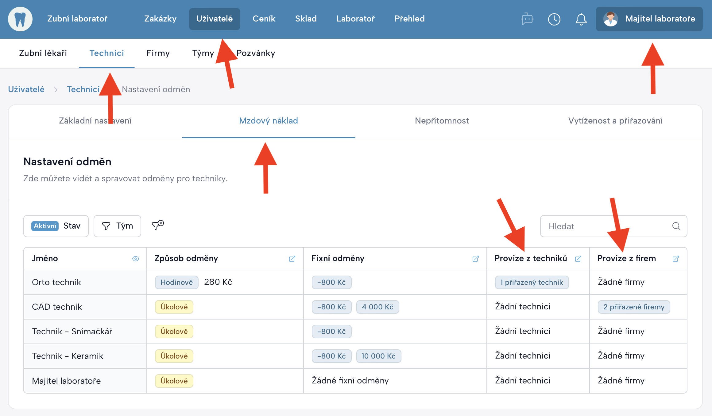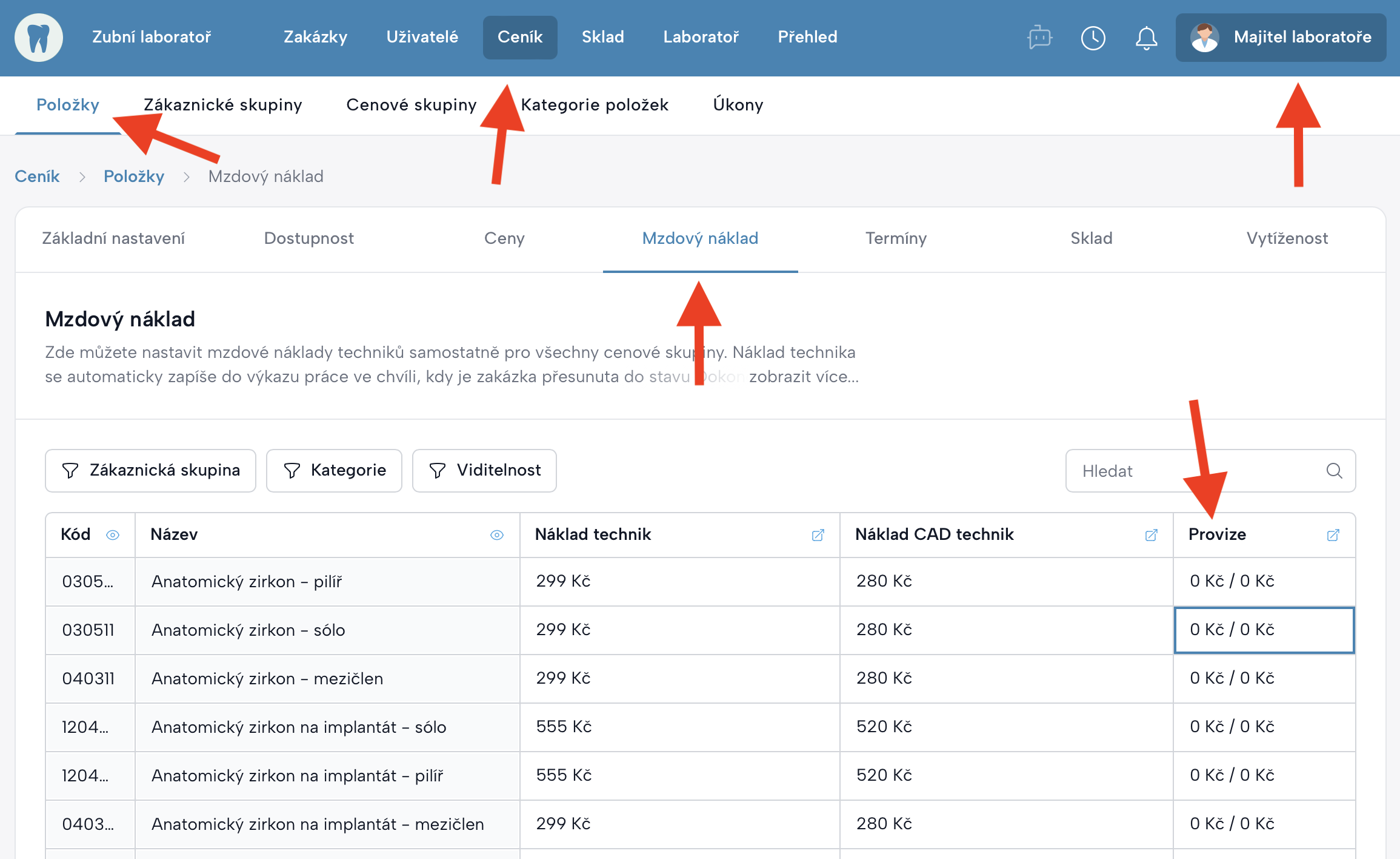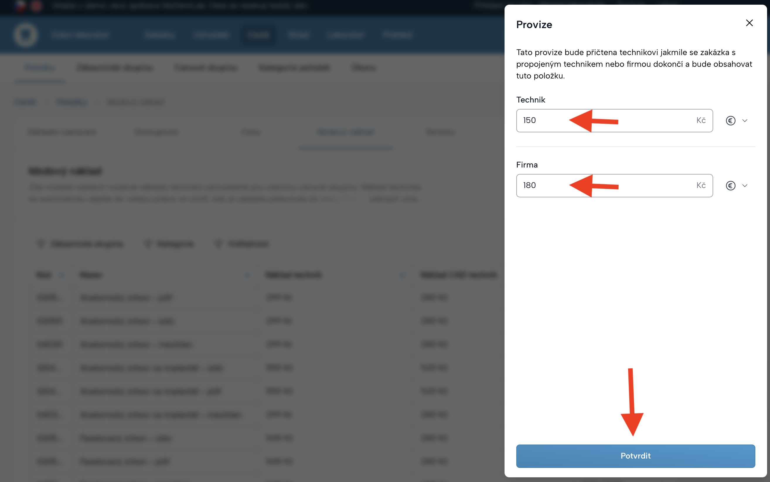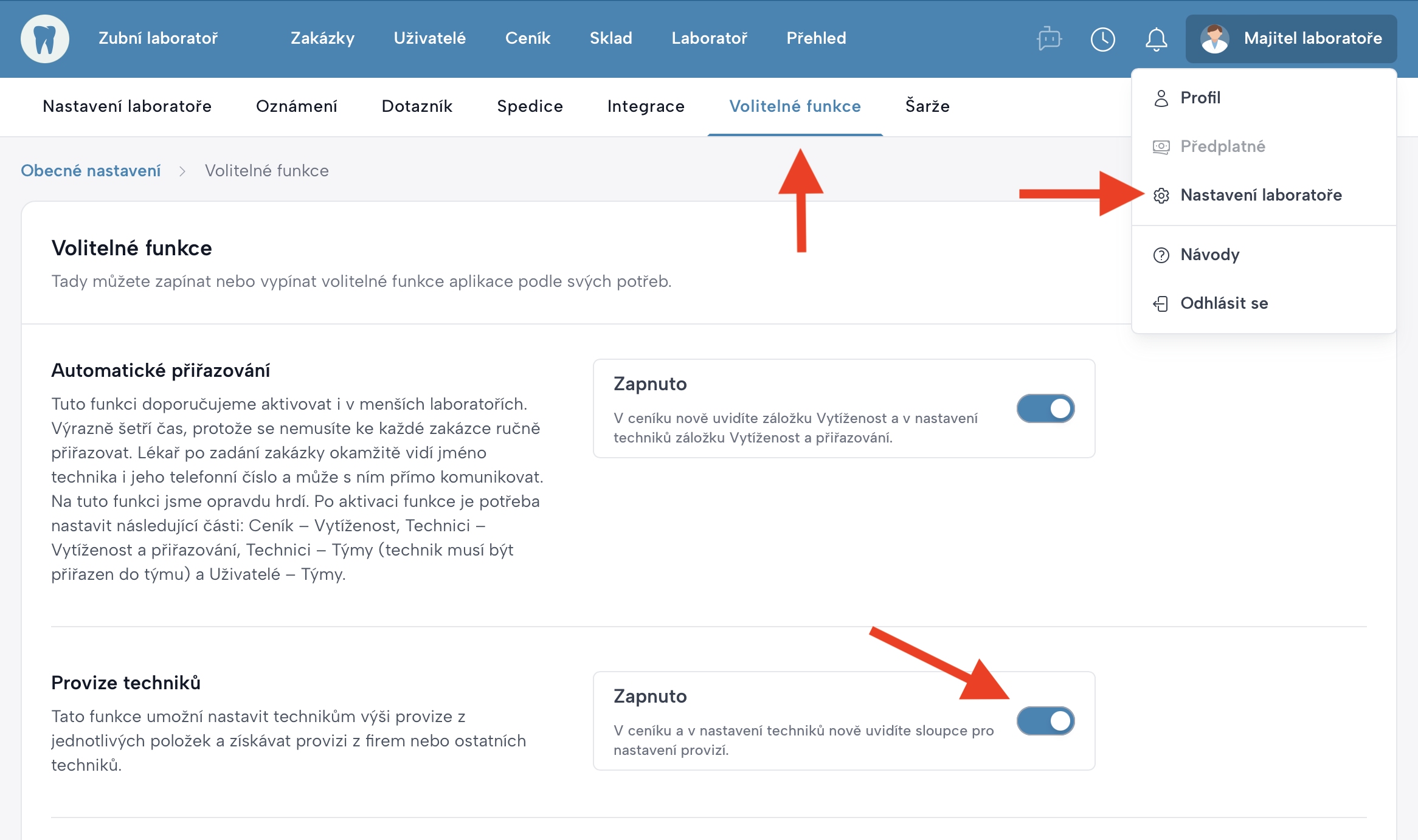 Nastavení laboratoře→Volitelné funkce→ Provize techniků - Po zapnutí se v aplikaci zobrazí nové sloupce a možnosti pro nastavení provizí.