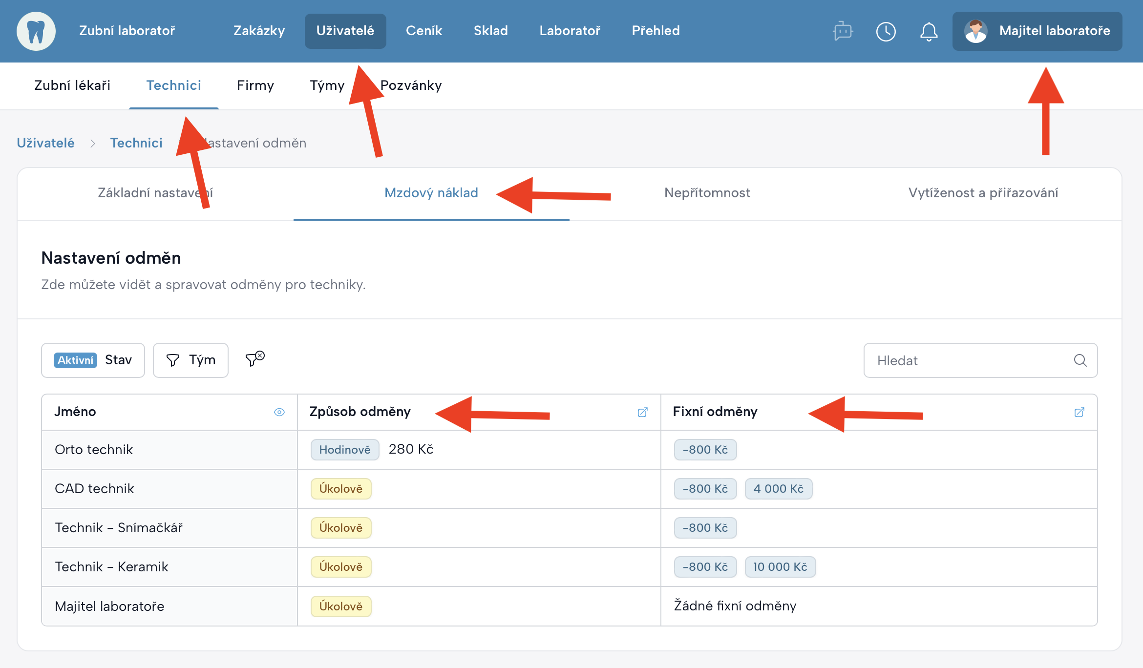 Mzdy v MyDentLab nevznikají pouze jedním způsobem. Systém umožňuje kombinovat více zdrojů odměňování tak, aby odpovídaly reálnému fungování zubní laboratoře.