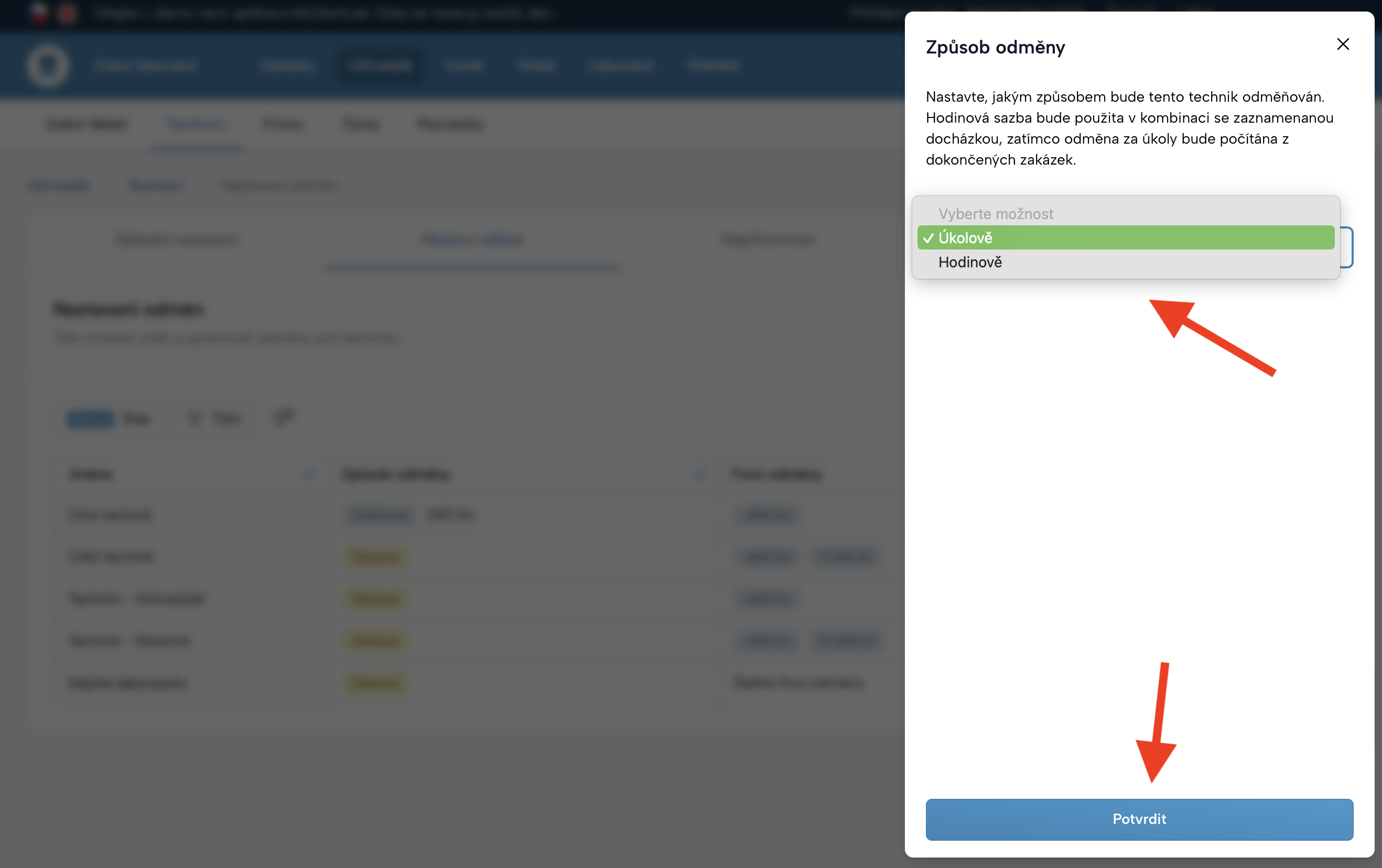 Ve sloupci Způsob odměny nastavíte, jakým způsobem bude technik odměňován: