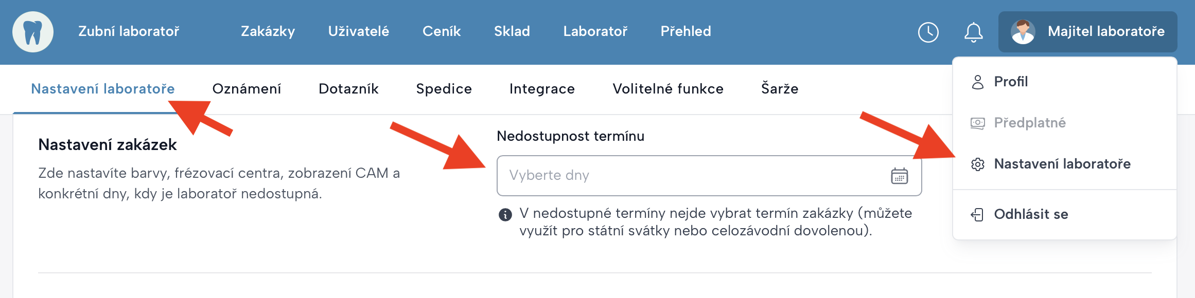V části Nastavení laboratoře → Nastavení zakázek → Nedostupnost termínu můžete určit dny, kdy laboratoř nebude dostupná pro zadávání termínů zakázek.