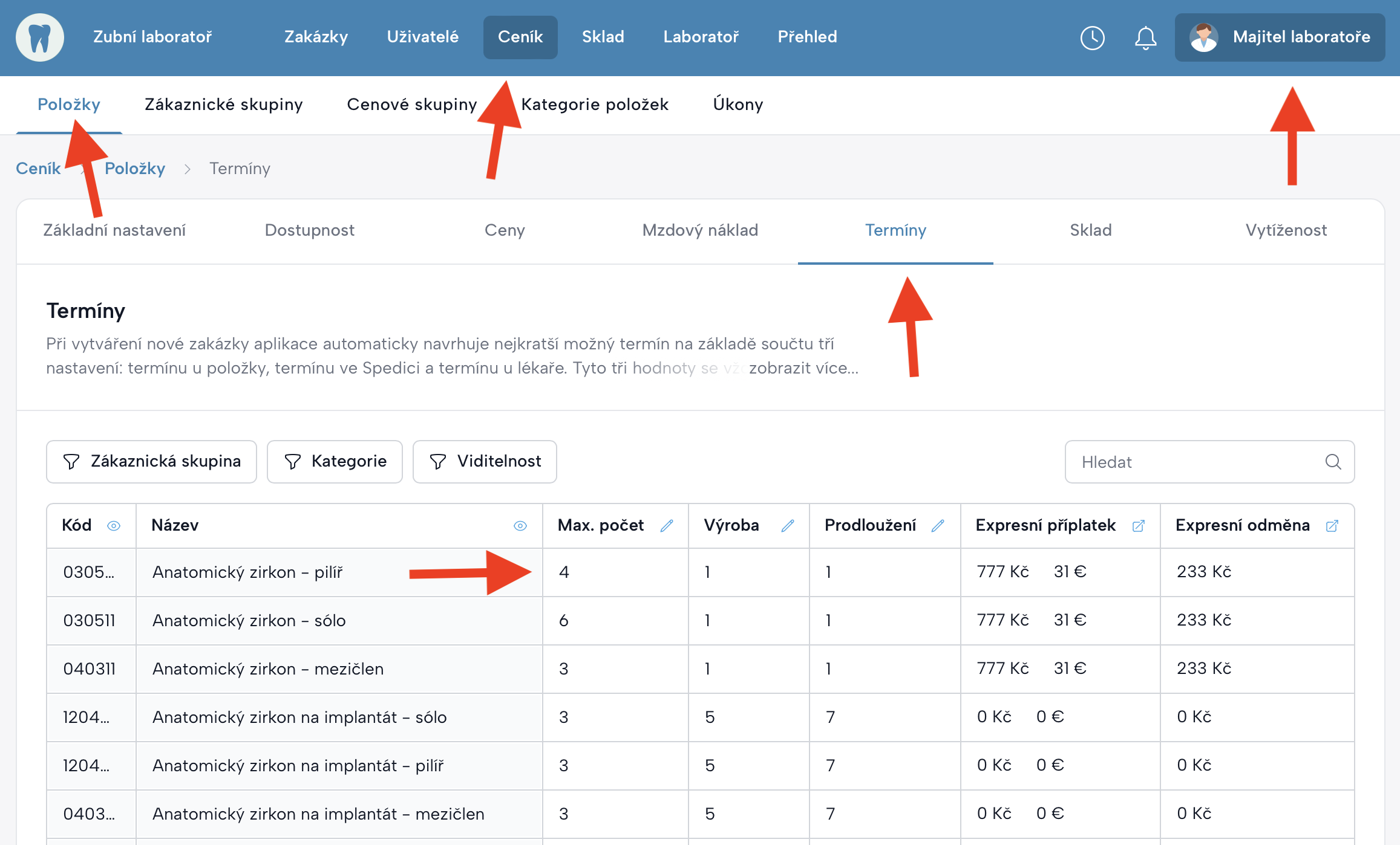 1. Termíny v Ceníku – položky