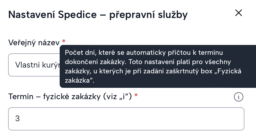 - Termín dopravy (ve Spedici – počet dní pro fyzické nebo digitální zakázky).