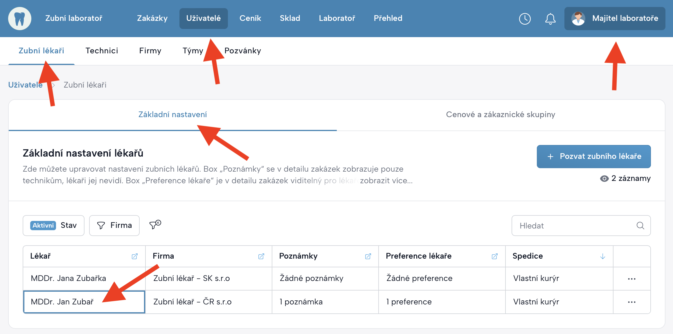 V Uživatelé → Zubní lékaři → Základní nastavení má každý lékař:
